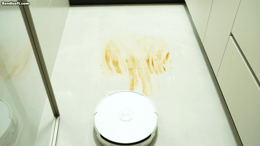 那么履帶活水洗地的清潔能力究竟如何?實際測試顯示,面對大面積油污、番茄醬等含油污漬,云鯨J6一遍即凈,且無輪印殘留。