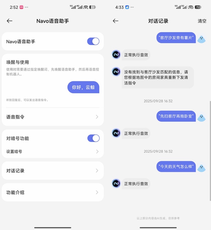 不僅支持一句話清潔,還能理解復雜和模糊指令,例如“沙發那兒撒了點薯片”,云鯨J6便會自動前往清潔,無需過多語音指令。